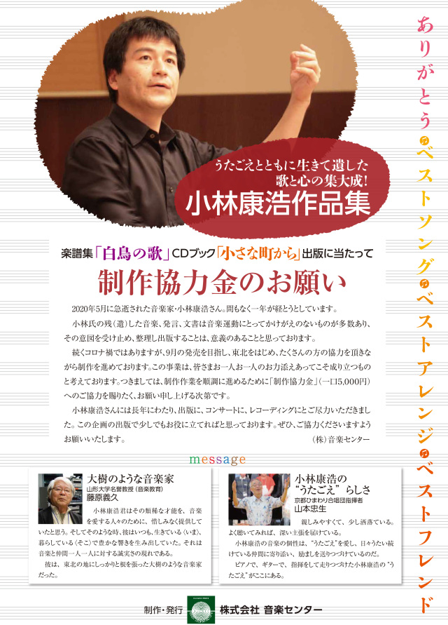 (株)音楽センターでは、2020年5月に急逝された音楽家・小林康浩さんの作品集(楽譜集・CDブック)出版にあたり、制作協力金の募集をしています。