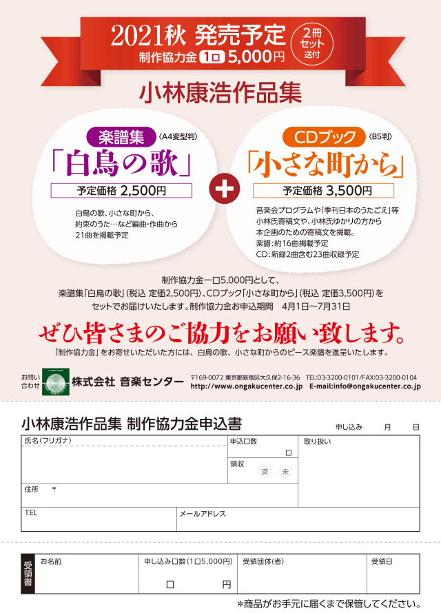 制作協力金一口5,000円としてご協力いただいた方には、楽譜集「白鳥の歌」(21曲掲載予定・税込定価2,500円予定)、CDブック「小さな町から」(本人およびゆかりのある方々から寄稿文、楽譜16曲掲載、新録音含む23曲収録予定・税込価格3,500円予定)を発売後にセットでお届けします。また、「白鳥の歌」「小さな町から」のピース楽譜を進呈いたします。