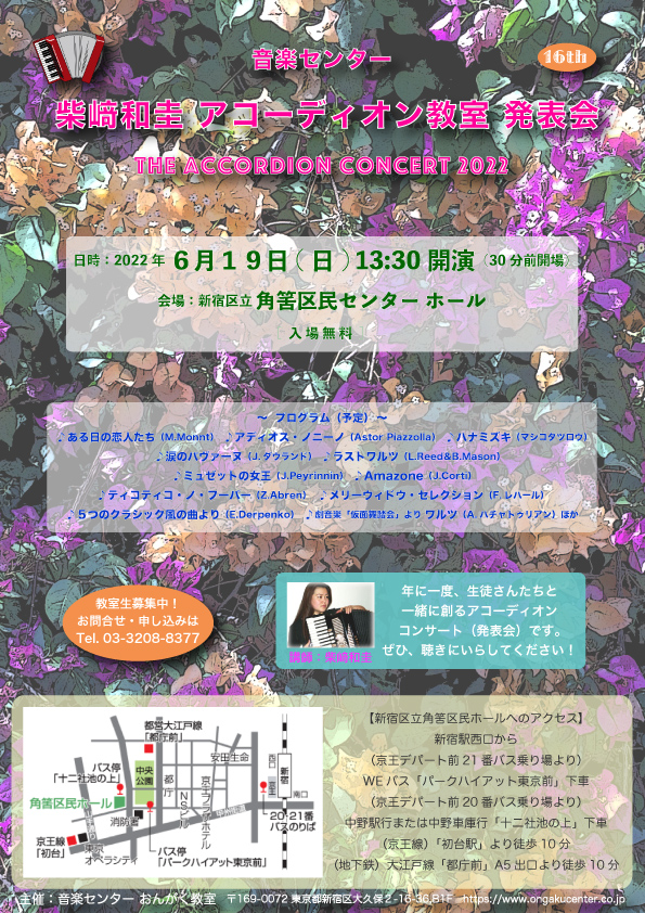音楽センターおんがく教室では、柴和圭先生のアコーディオン教室の演奏発表会を下記のとおり開催いたします。
