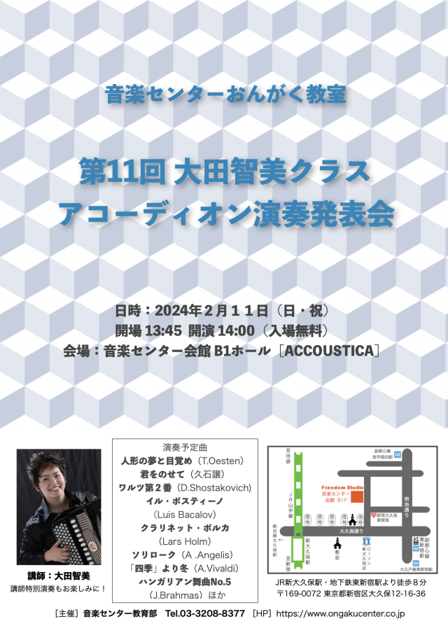 音楽センターおんがく教室では、アコーディオン大田智美クラスの演奏発表会を下記のとおり開催いたします。
